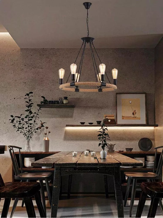LAMPADARIO ROTONDO RUSTICO IN CANAPA E METALLO PORTALAMPADA E27 INDUSTRIALE A20