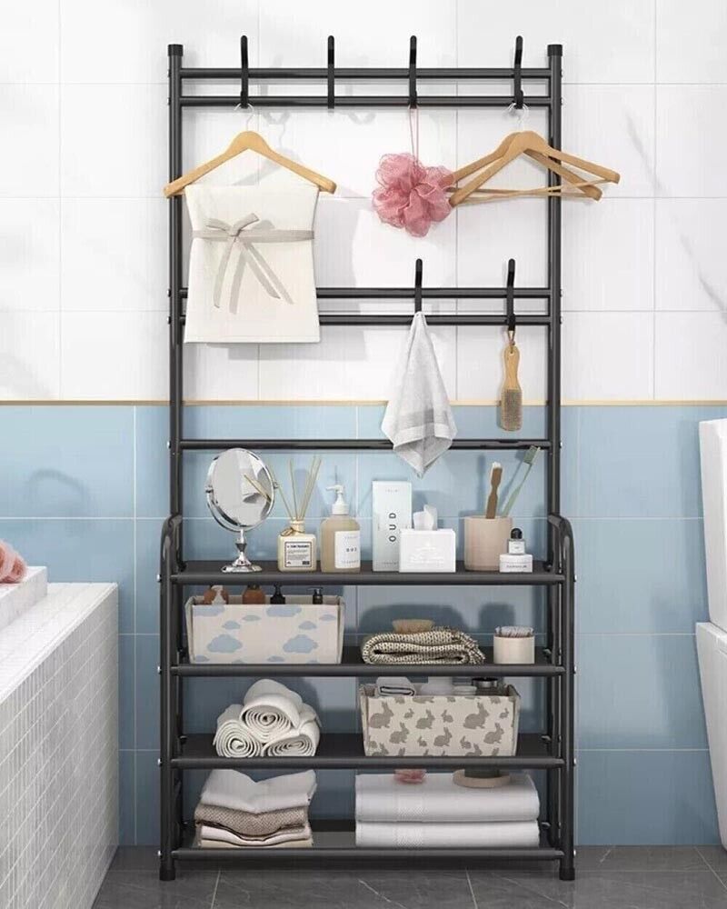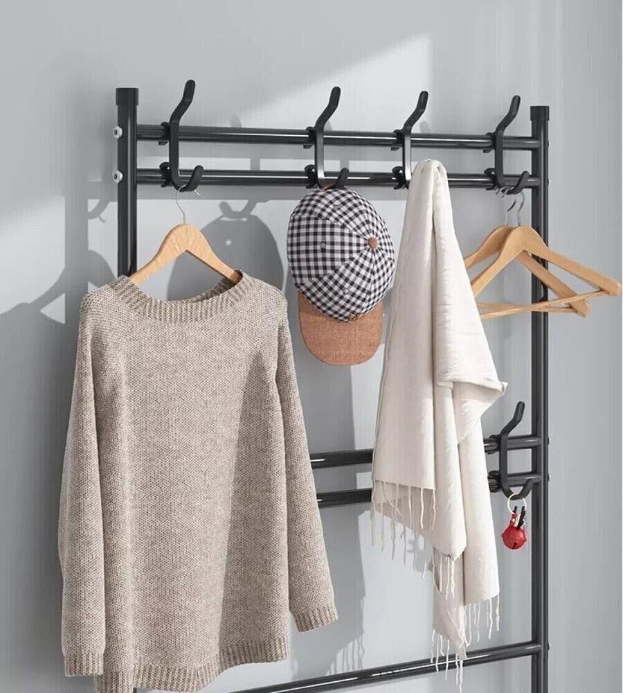 La parte superiore funziona da appendiabiti ed è fornita di ben 8 ganci dove è possibile appendere abiti e accessori come cappotti, camicie cappelli, ombrelli, borse, ecc.