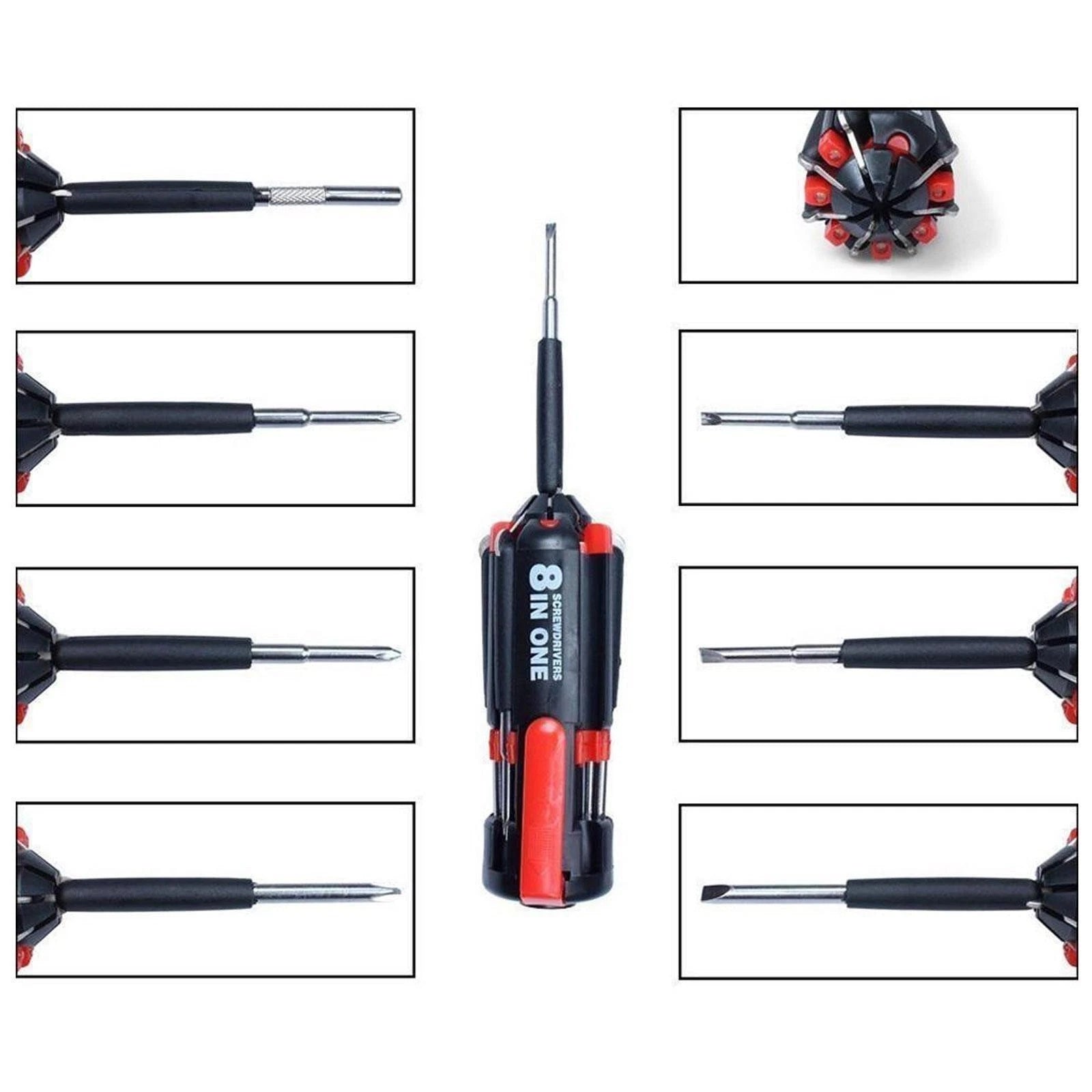 KIT COMPLETO 8-IN-1 RETRATTILE E SOLIDO: Non un semplice cacciavite, ma un set completo con 8 punte essenziali (3 lame diritte, 3 a stella, 1 mini doppia impronta) alloggiate in un corpo unico, robusto e compatto. Le punte a scomparsa garantiscono la massima praticità e ordine, eliminando la perdita di pezzi.