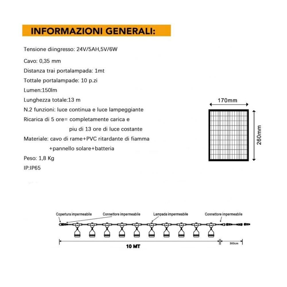 Catena prolunga con pannello solare e 10 lampadine completamente impermeabile per esterno. Lunghezza totale 13 metri con la spina, con la distanza di 1 metro tra i portalampada. Completo di 10 lampadine filamento a led luce calda.