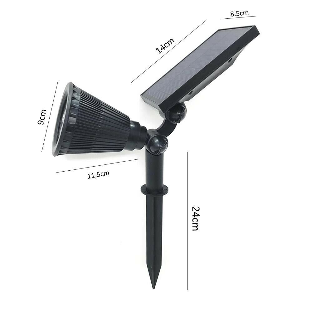Faretto con picchetto e pannello solare integrato. Dotato di sensore crepuscolare con la funzione di accensione e spegnimento autonomo: (si accende quando inizia scurire per poi spegnersi quando inizierà ad albeggiare.