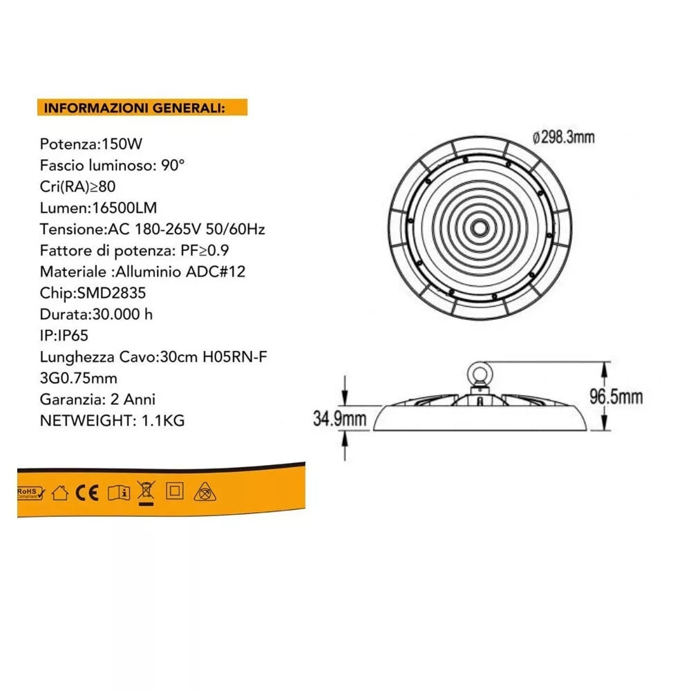 FARO LED LAMPADA INDUSTRIALE 150 W LUCE BIANCA UFO DISCO ROTONDO IP65 HE