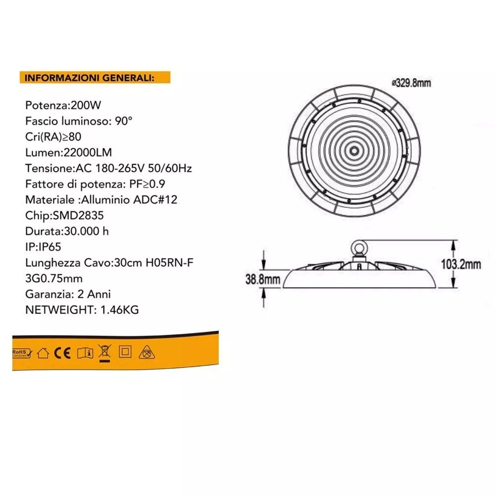 FARO LED LAMPADA INDUSTRIALE 200 W LUCE BIANCA DISCO ROTONDO UFO ESTERNO IP65 HE