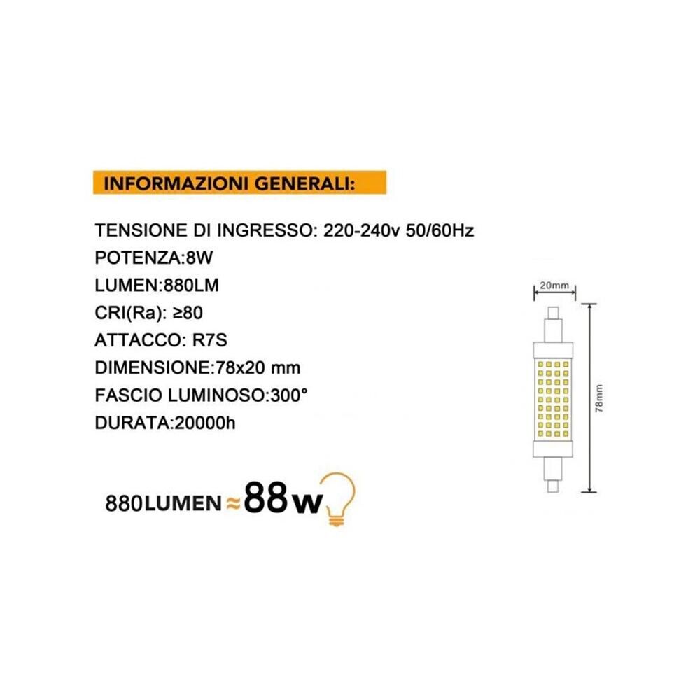 Lampadina led dalla potenza 8 watt con attacco R7S con l’angolo di emissione luce di circa 300°.