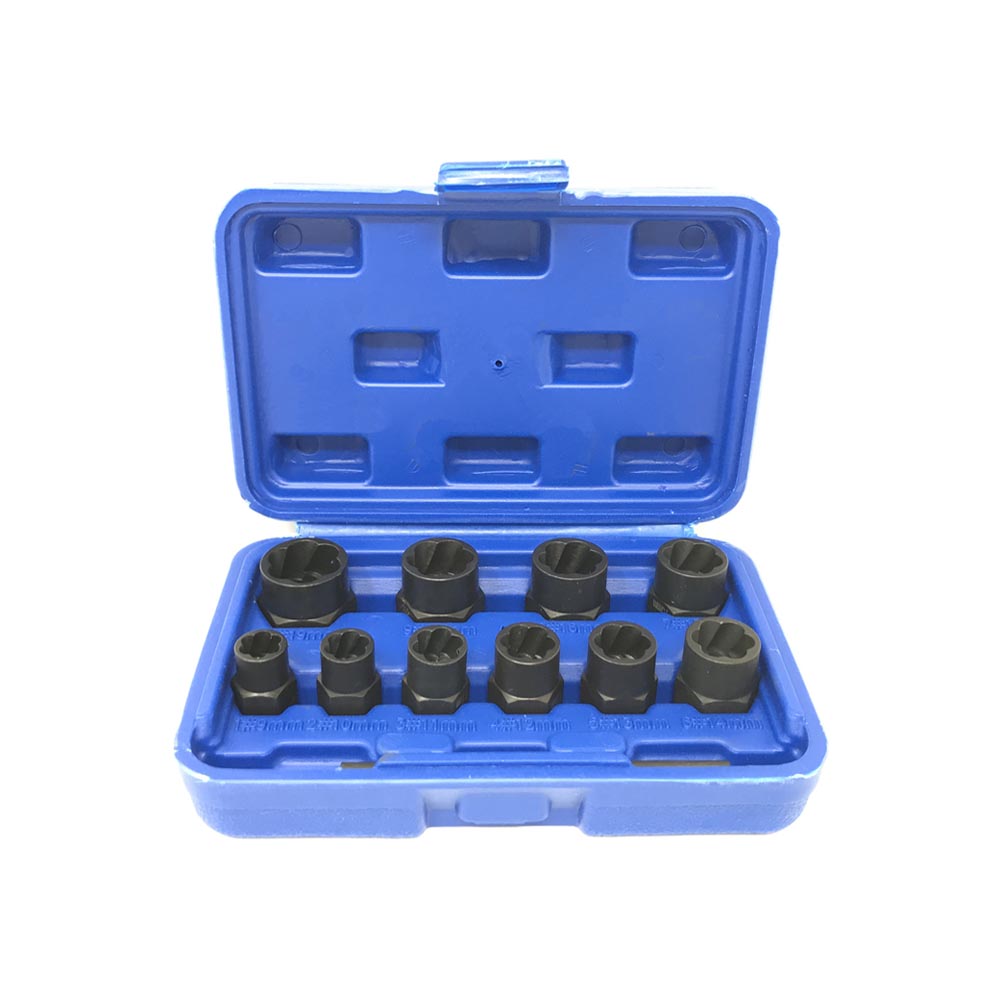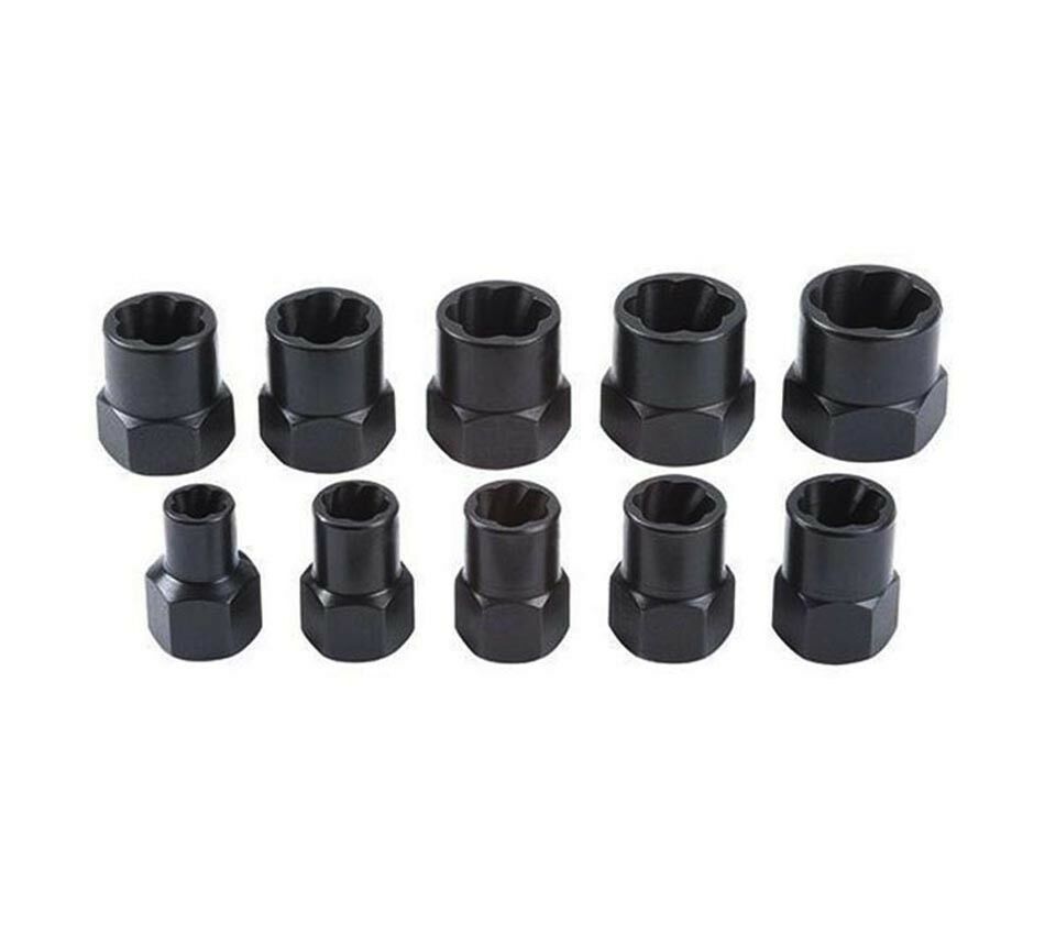 Set da 10 bussole estrattori per bulloni e dadi smangiati e danneggiati. Con questo prodotto potrete facilmente svitare quei fastidiosissimi dadi o bulloni danneggiati, spanati, o smangiati che con una normale chiave non riuscireste a smontare. Pratiche per lavori professionali o per il fai da te.