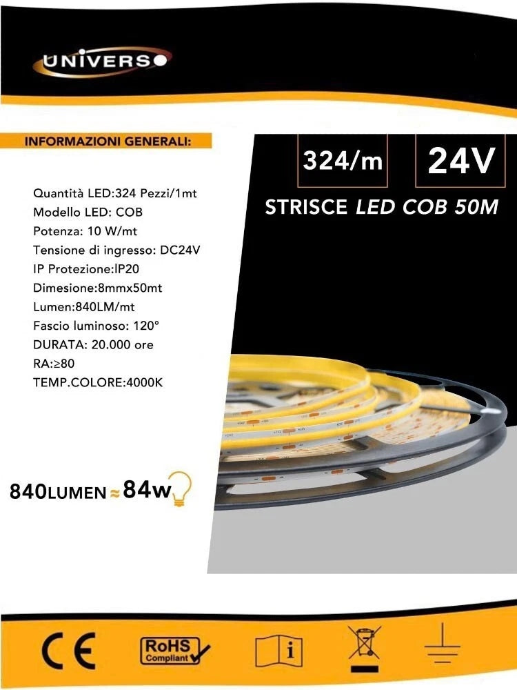 Striscia led cob strip bobina 50 metri 24v led smd 500 watt luce naturale 4000k
